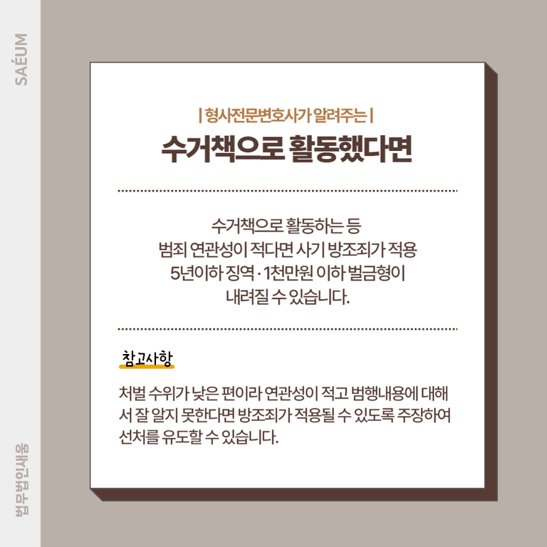 만일 수거책으로 활동하는 등 비교적 연루가 적게 된 상황이라면 가벼운 처벌이 내려올 가능성이 높은데요. 연관성이 적다면 사기가 아닌 방조죄가 적용될 수도 있습니다. 방조죄는 5년 이하의 징역 혹은 1000만원 이하의 처벌이 내려오게 되는데, 처벌 수위가 낮은 편이라 연관성이 적고 범행내용에 대해서 잘 알지 못한다면 방조죄가 적용될 수 있도록 주장하여 선처를 유도할 수 있습니다.