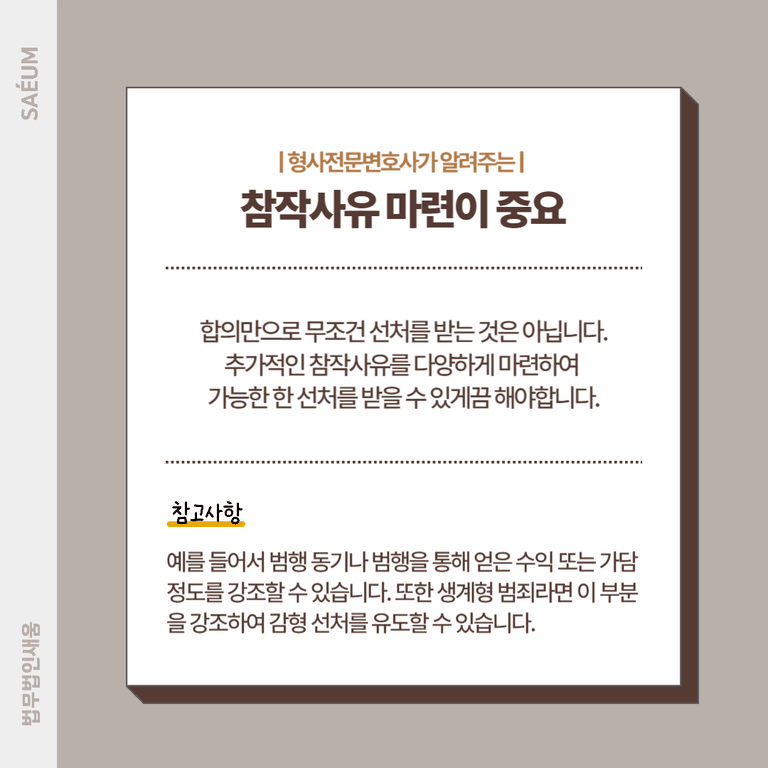 합의만으로 무조건 선처를 받는 것은 아닙니다. 그렇기에 보이스피싱 가해자의 입장이 되었다면 추가적인 참작사유를 다양하게 마련하여 가능한 한 선처를 받을 수 있게끔 해주어야 하는데요.