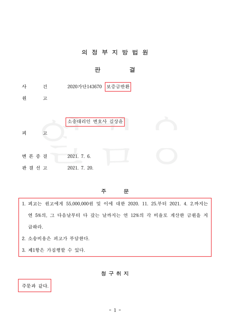 [승소] 보증금반환 청구 소송 전부승소 (21. 7. 20.)