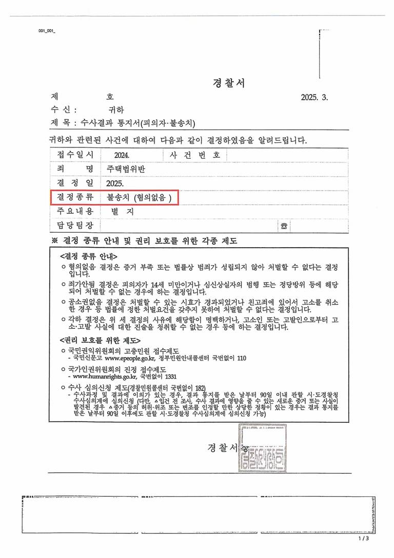 ◆ 사건처분 결과 - 혐의없음 불송치 처분!!