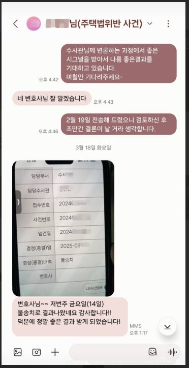 그 후 경찰은 변호인이 제출한 자료 등을 토대로 추가 조사를 한 끝에 의뢰인은 결국 혐의없음!! 처분을 받을 수 있었습니다.