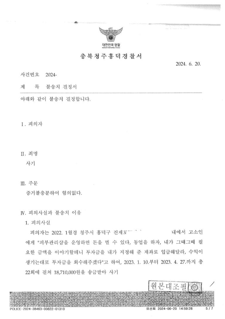 이에 경찰관은 본 변호인의 의견대로 피의자에게 무혐의(불송치)처분을 내려 주었습니다.