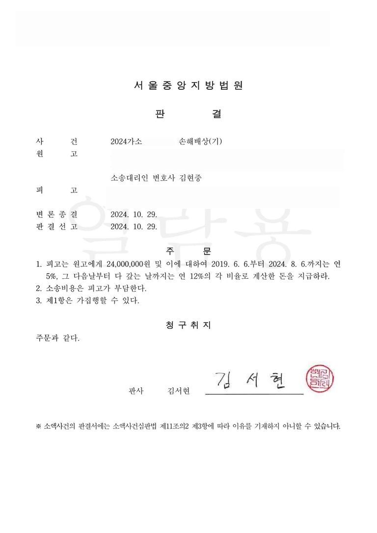 ****판결문을 보시면 아시겠지만 변호인으로서 제 이름만 들어가 있는 것을 확인하실 수 있습니다. 제가 온전히 혼자서 이끌어 낸 사례만을 저의 해결사례로 올리는 것이니 참고 바라며, 고용 변호사가 처리한 사건에서 제 이름만 들어간 사례라던 가 다른 변호사들과 함께 처리한 사건에서 제 이름이 들어갔다는 이유로 자신의 독자적인 해결사례인 것처럼 올리지 않습니다. 또한 착오가 없는 이상, 기존에 올렸던 해결사례를 일정 기간이 지난 후에 새로운 해결사례인 것처럼 재차 업로드 하지 않습니다. (날짜가 최근날짜가 아닌 것은 재업로드 한 것이 아니라, 바빠서 과거에 올리지 못한 해결사례를 이제서야 올리는 것 입니다. 영업에 크게 관심이 없는 이유로 미처 올리지 못한 해결사례들이 너무 많이 쌓여 있습니다.)****