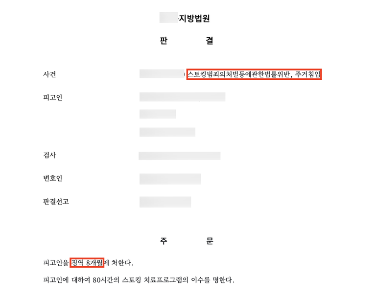 피해자의 입장을 떠올리면 마음이 무거워질 수밖에 없는 사건이었습니다. 의뢰인은 이전에도 스토킹으로 고통을 겪었던 분이었고, 피고인은 실형을 살고 나온 뒤에도 연락을 멈추지 않았습니다. 불과 며칠 사이에 390여 회에 달하는 메시지와 전화, 피해자의 집까지 찾아가 문을 두드리고, 급기야 자녀들만 있는 늦은 밤에 주거에 침입하는 일까지 벌어졌습니다. 누범기간 중에 반복된 범행이라는 점에서 죄질은 결코 가볍지 않았습니다. 다행히 저희가 피해자 의사를 충분히 반영한 고소를 통해, 피고인에게 징역 8개월의 실형과 스토킹 치료 프로그램 이수 명령이 함께 선고되었습니다.