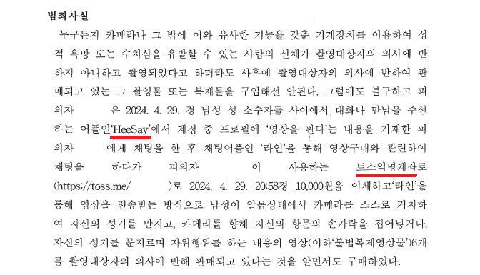 성소수자 A씨는 2024. 4. 29.경 성소수자 전용 어플리케이션 'HeeSay'에서 "영상을 판매한다"고 광고하는 B씨를 발견하고 B씨의 안내에 따라 라인으로 구매의사를 밝힌 다음 B씨에게 토스익명계좌로 10,000원을 이체하고 B씨로부터 라인으로 게이 동영상 총 6개를 전송받았습니다.