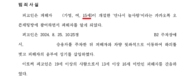 A씨는 2024. 8. 25.경 카카오톡 오픈채팅을 하다가 15세라고 밝히며 만날 사람을 구하는 B양을 발견하고 연락하여 만나 차량에서 성관계를 하였습니다.