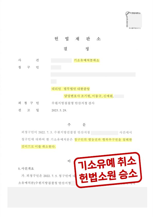 이에 이동규 변호사는 의뢰인의 억울한 기소유예 처분을 취소하기 위해 헌법소원심판을 청구하였습니다.
