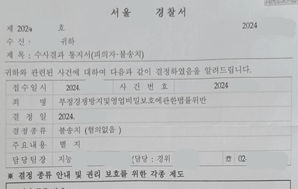 경찰서 지능팀에서 전문적으로 수사가 이루어졌음에도 불구하고, 저희가 경찰조사에 치밀하게 대응하고 변호인의견서를 제출하여 무혐의를 치열하게 다툰 결과, 결국 경찰단계에서 바로 불송치 결정(무혐의)이 나왔습니다!