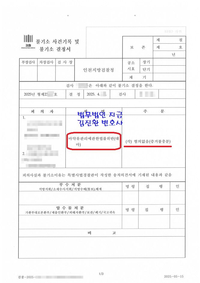 검사도 세관 마약수사팀의 의견과 같이 마약류를 고의적으로 수입했다고 볼 만한 증거가 없다는 이유로 불송치(혐의없음) 결정을 내리게 되었습니다.