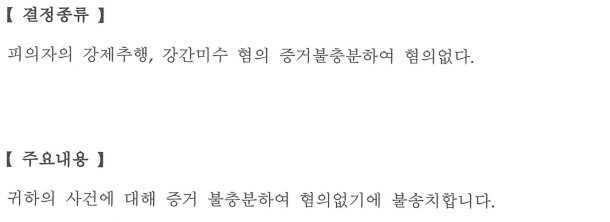 예상되로 전부 불송치(혐의없음)가 나오게 되었습니다. 무혐의를 주장하는 사건일수록 초기에 변호인과 함께 대응을 해야, 원하는 결과를 받을 수 있는 확률이 높아집니다. 일단 기소가 되면 무죄를 받기는 많이 어려워지므로, 초기단계에서부터 철저한 대응을 해야 합니다.