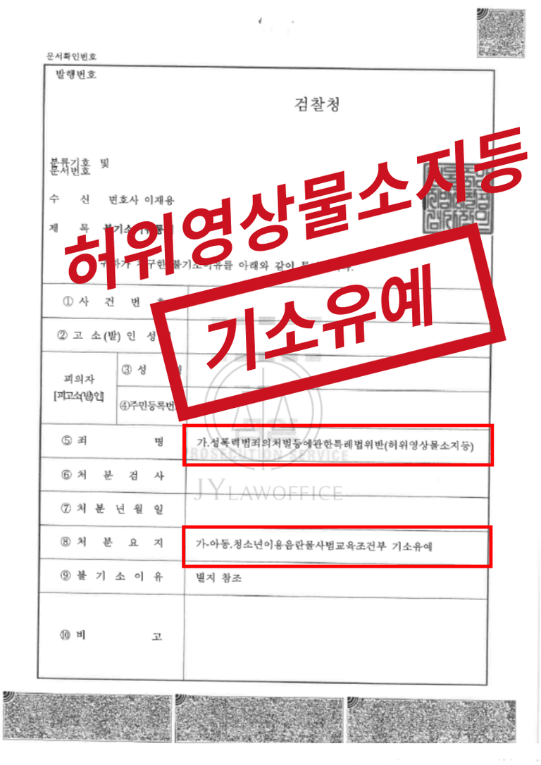 이와 같은 성범죄 전문 변호사의 조력에 따라, 의뢰인은 허위영상물 소지 등의 혐의에서 기소유예의 불기소 처분을 받으며 사건을 무사히 마무리할 수 있었습니다.