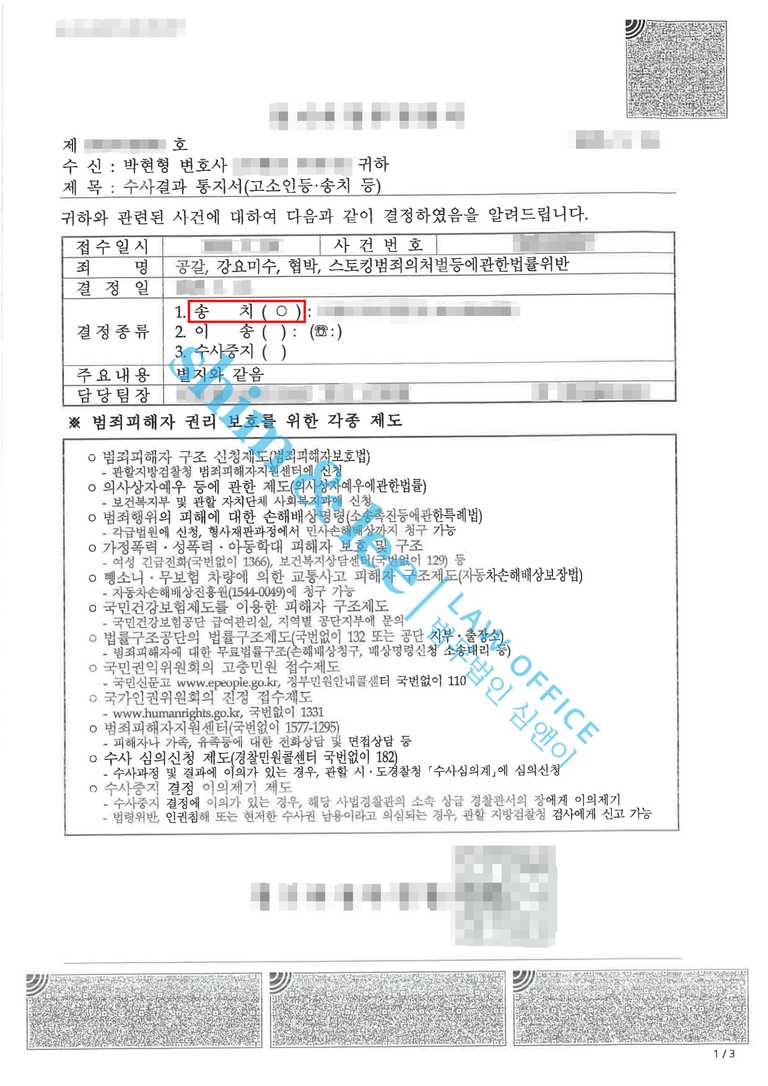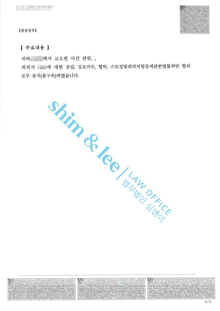 - 결국 변호사님이 특정한 공갈, 강요미수, 협박, 스토킹 네 가지 행위가 모두 인정되어 본 사건은 검찰로 송치되었습니다. 현재 심앤이는 검찰 단계에서도 사건이 정식 기소로 이어질 수 있도록 최선을 다해 대응하고 있습니다.