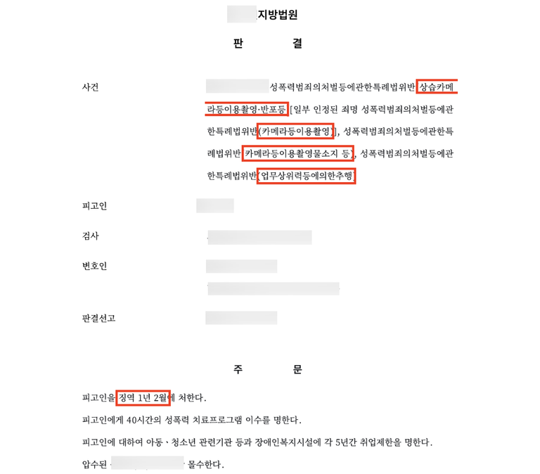 저는 피해자분들을 대신해 단호한 고소를 진행했고, 피고인에게 징역 1년 2월의 실형과 성폭력 치료프로그램 이수, 취업제한 명령이 내려졌습니다. 재판부는 “범행 수법이 계획적이고 장기간 지속되었으며, 촬영 부위나 노출 정도로 인해 성적 불쾌감이 크다”는 점을 엄중히 지적했습니다. 피고인은 범행을 인정하고, 일부 피해자와의 합의를 주장했지만, 피해자들이 겪은 정신적 고통과 회복되지 않은 상처는 결코 가볍지 않았습니다. 저는 피해자 입장에서 철저히 전략을 세워 중형을 이끌어냈고, 이처럼 가해자의 중대한 처벌을 끌어내는 데 누구보다 자신 있습니다. 또한 합의는 반드시 변호사를 통해 이뤄져야 합니다. 무분별한 사적 조율은 결과적으로 말도 안 되는 금액이나 불공정한 조건으로 이어지고, 수천만 원의 손해가 발생하는 사례도 많습니다.