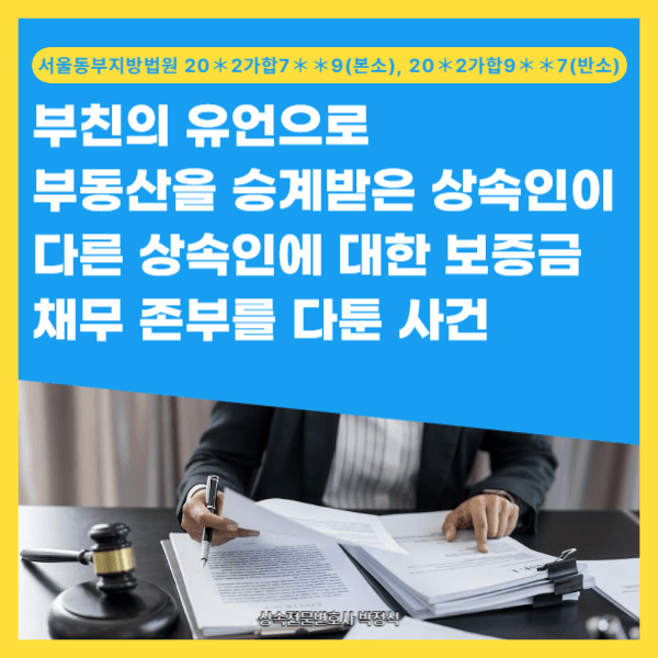 그런데 위 부동산은 다른 자녀인 장남인 피고가 살고 있는 부동산이었습니다. 피고는 원고에게 자신과 부친이 이 부동산에 대해서 임대차계약을 체결하였고, 자신이 보증금 2억원을 부친에게 지급하였으므로, 위 부동산을 유증 받은 원고가 모두 갚아야 한다고 주장하였습니다.