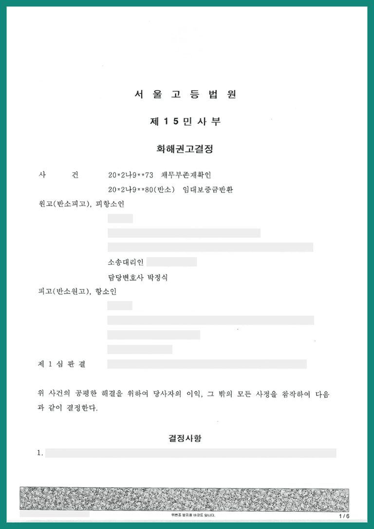 ④ 전술한 바와 같이 원고가 임대인 지위를 승계하였더라도 피고에게 이 사건 임대차보증금을 반환할 의무가 없다면서, 이에 기초하여 1심에서는 원고의 이 사건 채무부존재확인 청구는 이유 있으므로 인용하였고, 피고의 임대차보증금반환 반소청구는 기각하였으나, 항소심에서는 화해권고결정을 통하여 피고는 원고에게 1억 원의 임대차보증금반환채권이 존재함을 확인하여 주었고, 원고는 피고로부터 아파트를 인도받음과 동시에 위 임대차보증금을 상환으로 지급하도록 판결하였습니다.