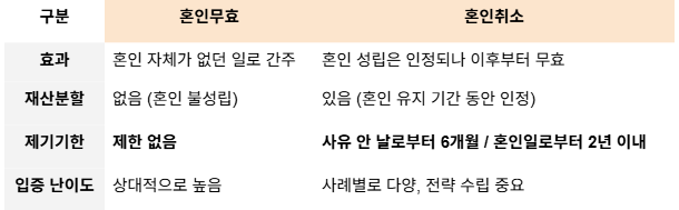 즉, 혼인무효는 형식·자격 자체의 결함, 혼인취소는 정상적 의사결정이 결여된 채 진행된 혼인이라는 점에 중점을 둡니다.