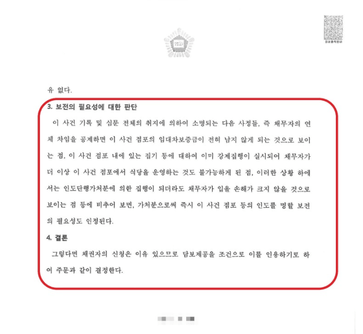 사건을 담당한 재판부는 부동산명도단행가처분이 인용되어야 할 필요성을 인정해주어, 부동산명도단행가처분 인용 결정을 선고하였습니다.