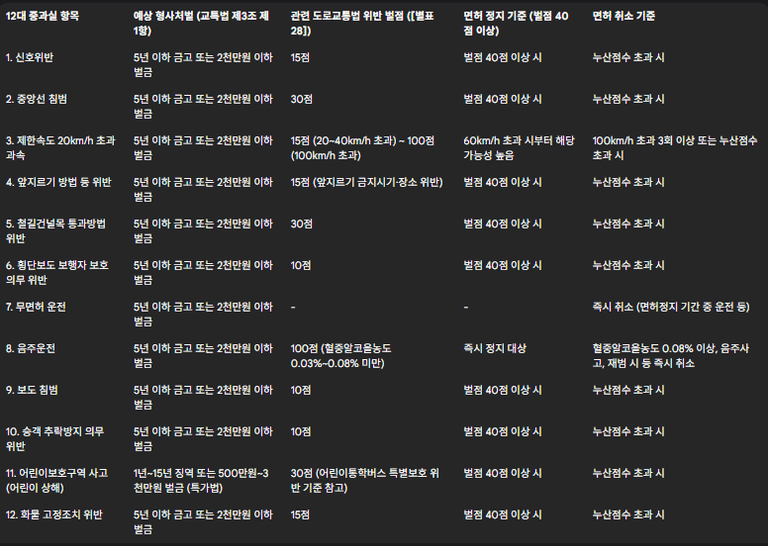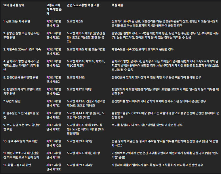 12대 중과실 교통사고는 다음과 같으며, 각 유형별 구체적인 내용과 법적 근거는 아래 표와 같습니다.