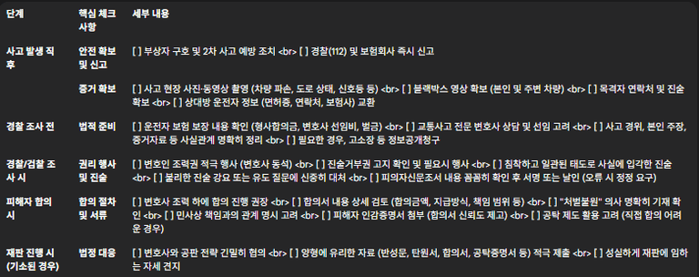 변호사 선임: 가능한 한 경찰 조사 전에 교통사고 전문 변호사와 상담하고 선임하는 것이 바람직합니다. 변호사는 사건의 법적 쟁점 분석, 조사 시 예상 질문 및 답변 방향 조언, 증거자료 검토 등 전반적인 법적 조력을 제공합니다.