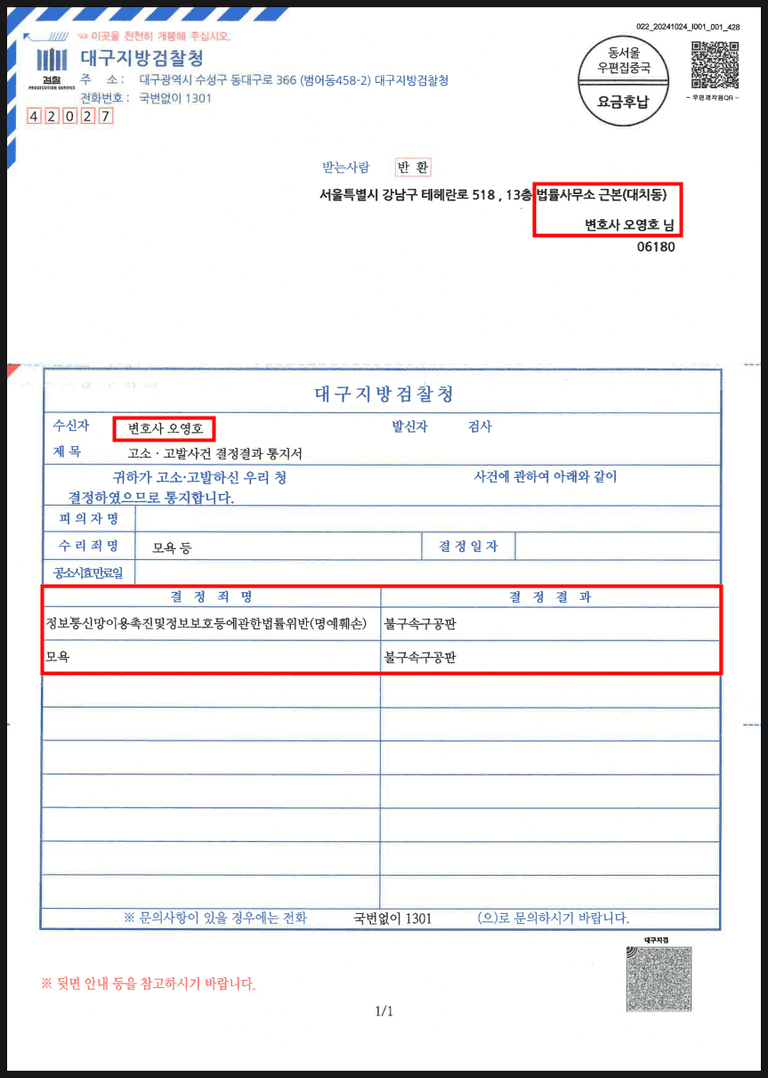 <고소고발사건 결정결과 통지서>