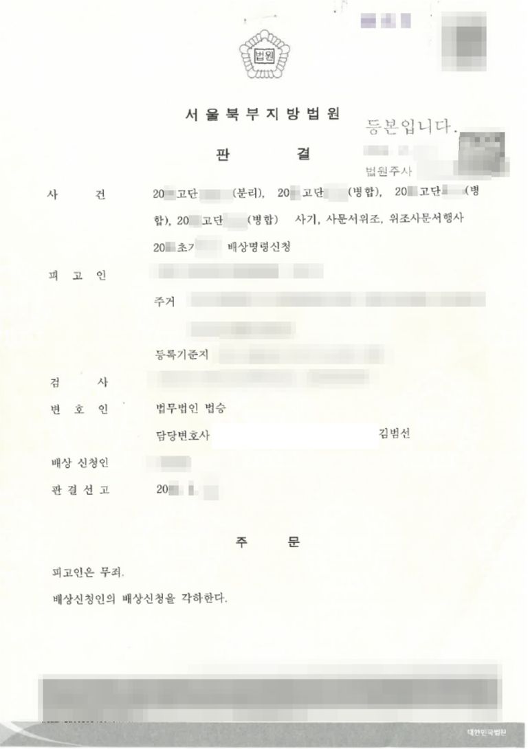 그 결과 재판부는 피고인에 대한 이 사건 공소사실은 모두 범죄의 증명이 없는 때에 해당하므로 형사소송법 제325조 후단에 의하여 무죄를 선고하고, 소송촉진 등에 관한 특례법 제32조 제1항 제2호에 따라 배상신청인의 신청을 각하하였습니다.