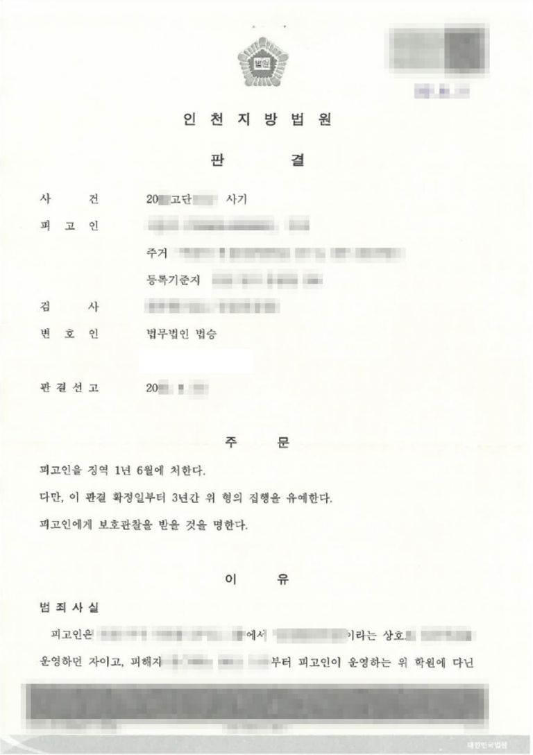 그 결과 인천지방법원 재판부는 의뢰인에게 징역 1년 6월에 집행유예 3년을 선고하여 주었습니다.