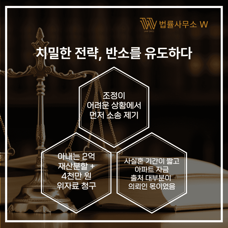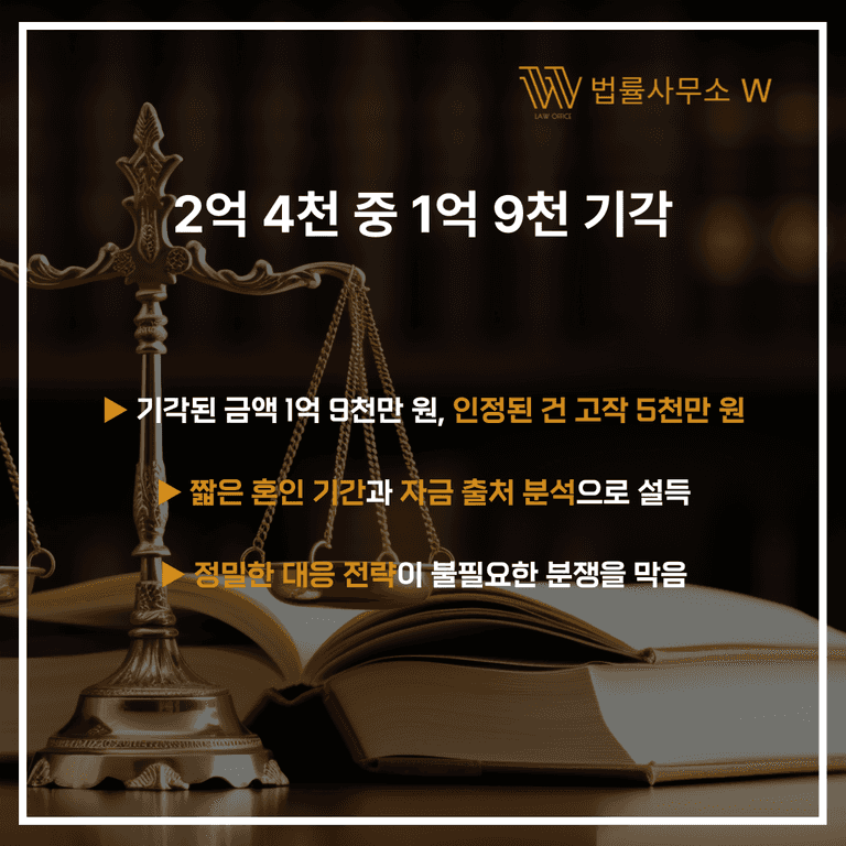 아내 측은 위자료 4천만 원과 재산분할 2억 원을 청구했지만, 혼인 기간 1년 미만, 기여도 부족, 남편 명의 아파트 시세 차익을 근거로 반박해 총 2억4천만 원 중 1억9천만 원을 기각, 단 5천만 원만 인정받게 만든 사건입니다.