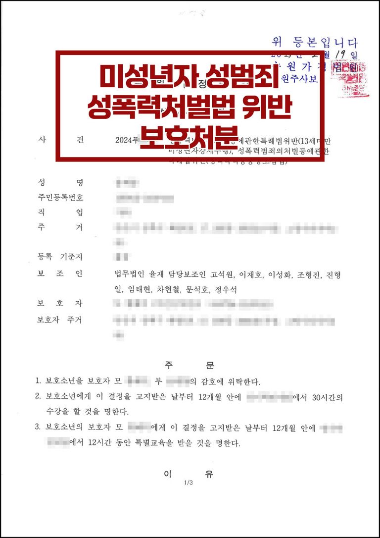 당시 범죄의 내용으로 보아 형사부 재판을 받을 가능성이 매우 높았지만 적극적인 변호와 방어로 소년부 재판을 통해 보호처분 중 가장 가벼운 1호로 마무리할 수 있었습니다.