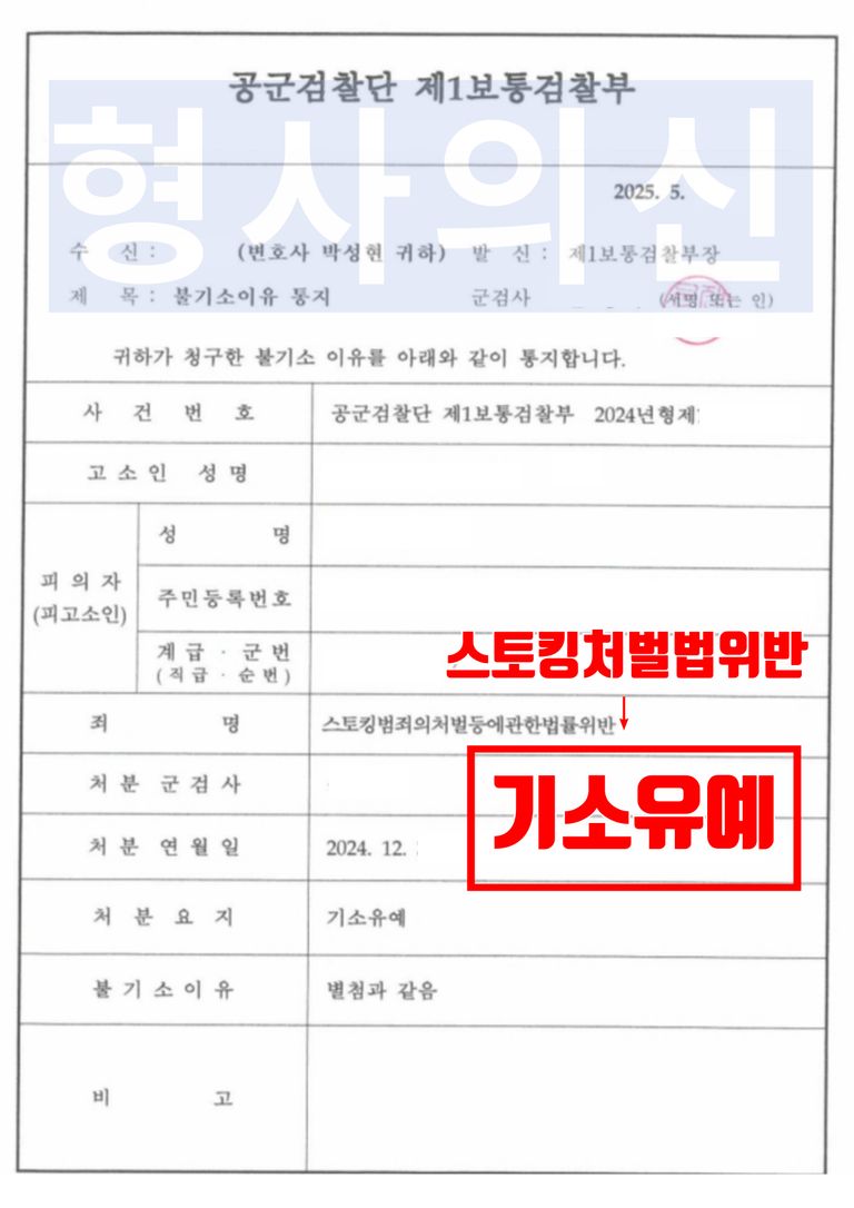 공군검찰단 제1보통검찰부 군검사는 법률사무소 유(唯)의 형사전문변호사의 주장 및 제출한 양형사유를 받아들여, 범행 사실은 인정되나, 피의자가 어린 나이로 이전까지 성숙한 이성관계를 경함한 적이 없는 점, 피해자와 원만히 합의하여 피해회복을 위한 노력을 다하였고, 피해자 역시 처불불원 의사를 밝힌 점, 피해자의 의사를 정확하게 이해하지 못하고 반복적인 연락에 이른 것을 깊이 반성하는 점 등 참착할 만한 사유가 있다고 판단하여‘기소유