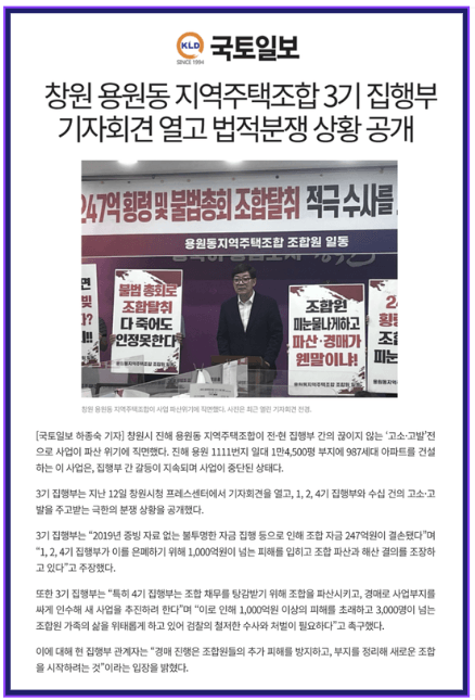 경상남도 창원시 진해구 용원동 일대에 아파트 건립을 위해 설립된 용원동 지역주택조합은 사업이 중단되었다고 해도 무방할 정도로 10년 넘게 사업이 지체되어 왔습니다. 그 과정에서 집행부가 네 차례나 교체되며 내부적으로 갈등이 이어졌고, 이에 따른 여러 문제점이 나타나고 있는 상황입니다. 특히 지난 9월에는 제3기 집행부가 기자회견을 열어 천억 원 규모의 불투명한 자금 집행에 대한 수사가 필요하다고 주장하는 등 여전히 내부 갈등이 심각한데다, 파산 위기감마저 고조되고 있어 향후 사업의 실현 가능성마저 사실상 어려운 상태로 보입니다.
