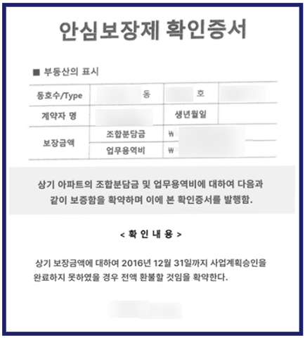 따라서 해당 안심보장제 확인증서를 가지고 계신 분들께서는 특별한 쟁점이 없는 경우, 무효의 문서로 가입계약을 유도한 기망행위를 근거로 하여 소송을 통해 계약을 취소하고 납입하신 분담금을 전액 반환받으실 수 있습니다.