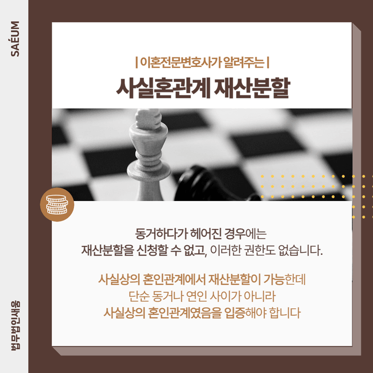 일반적인 연인관계에서 동거하다가 헤어진 경우에는 재산분할을 신청할 수 없고, 이러한 권한도 없습니다. 사실상의 혼인관계여야만 사실혼 재산분할이 가능한데요. 따라서 본격적으로 분할을 청구하기 전에, 단순 동거나 연인 사이가 아니라 사실상의 혼인관계였음을 입증할 수 있어야 합니다.