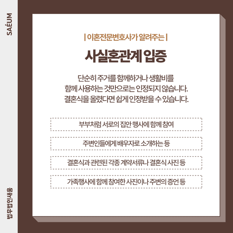 단순히 주거를 함께하거나 생활비를 함께 사용하는 것만으로는 인정되지 않으며, 정말 부부처럼 서로의 집안 행사에 함께 참여하거나 주변인들에게 배우자로 소개하는 등의 조건이 충족되어야 합니다.