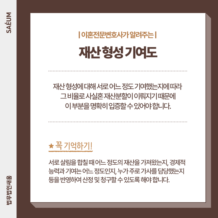 또한 해당 재산 형성에 대해 서로 어느 정도 기여했는지에 따라 그 비율로 사실혼 재산분할이 이뤄지기 때문에, 이 부분을 명확히 입증할 수 있어야 합니다. 서로 살림을 합칠 때 어느 정도의 재산을 가져왔는지, 경제적 능력과 기여는 어느 정도인지, 누가 주로 가사를 담당했는지 등을 반영하여 산정 및 청구할 수 있도록 해야 합니다.