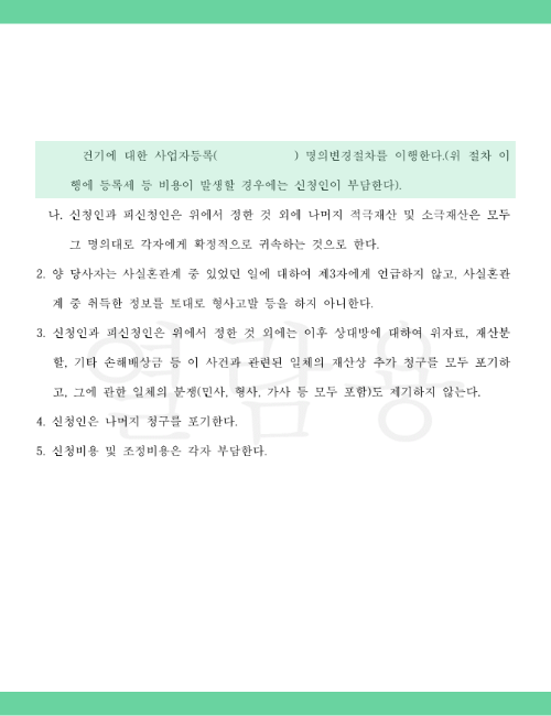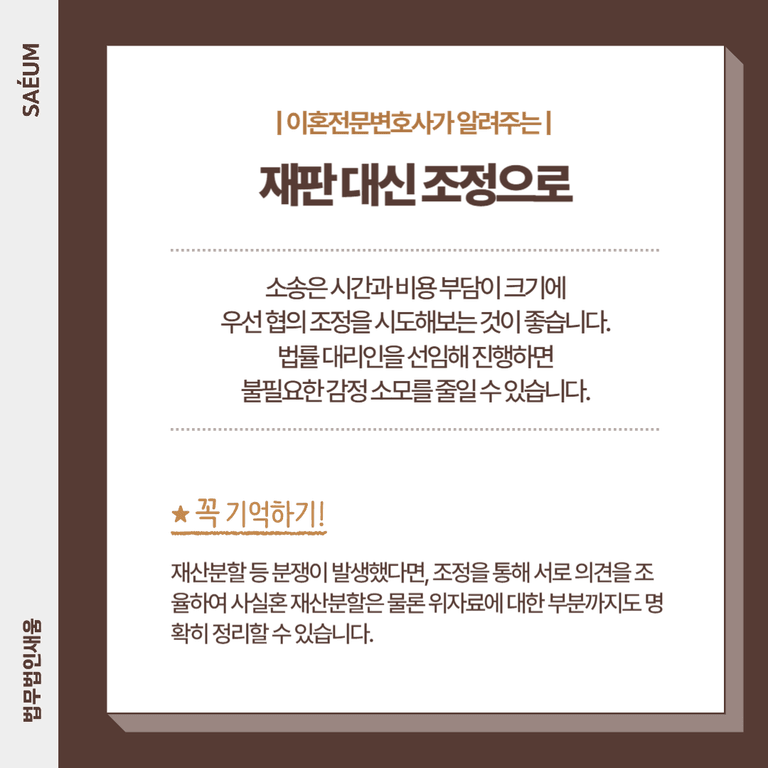 또한 시간과 비용의 부담이 크기 때문에 우선은 다른 방법을 시도해보는 것이 좋습니다. 조정을 통해 서로 의견을 조율하여 사실혼 재산분할은 물론 위자료에 대한 부분까지도 명확히 정리할 수 있습니다. 물론 의견 조율이 쉽지 않을 수 있지만, 법률자문을 받아 대응한다면 보다 수월하게 이끌어갈 수 있습니다.