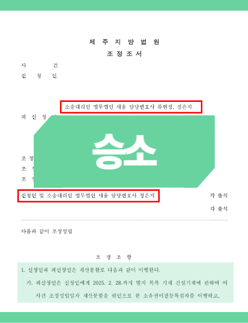 법무법인 새움에서는 A씨를 도와 1회 조정으로 사실혼 해소에 따른 재산분할을 이끌어냈습니다. A씨가 꼭 확보해야 하는 동산까지도 안전하게 이전받는 조건으로 조정을 성립시킬 수 있었습니다. 이 과정은 A씨가 사실혼 재산분할을 의뢰한 후 3개월 만에 이루어졌으며, 또한 사실혼 해소로 인해 A씨가 추가적인 피해를 보는 일이 없도록 조서 내에 이후 명예훼손이나 기타 형사문제가 발생하지 않도록 한다는 조항을 추가해 안전하고 빠르게 원하는 조건에 맞춰 관계를 정리할 수 있었습니다.