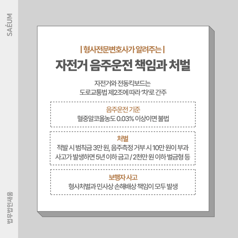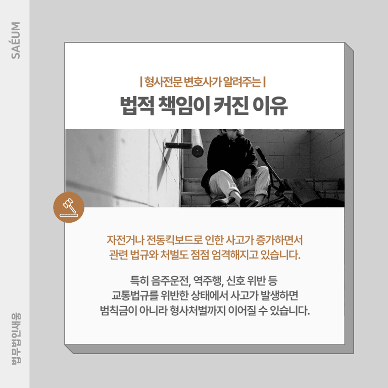 자전거나 전동킥보드로 인한 사고가 증가하면서, 관련 법규와 처벌도 점점 엄격해지고 있습니다. 특히 음주운전, 역주행, 신호 위반 등 교통법규를 위반한 상태에서 사고가 발생하면, 단순 범칙금이 아니라 형사처벌까지 이어질 수 있습니다. 하지만 많은 분들이 “자전거니까 괜찮겠지”라는 안일한 생각으로 법적 위험에 노출되고 있습니다.