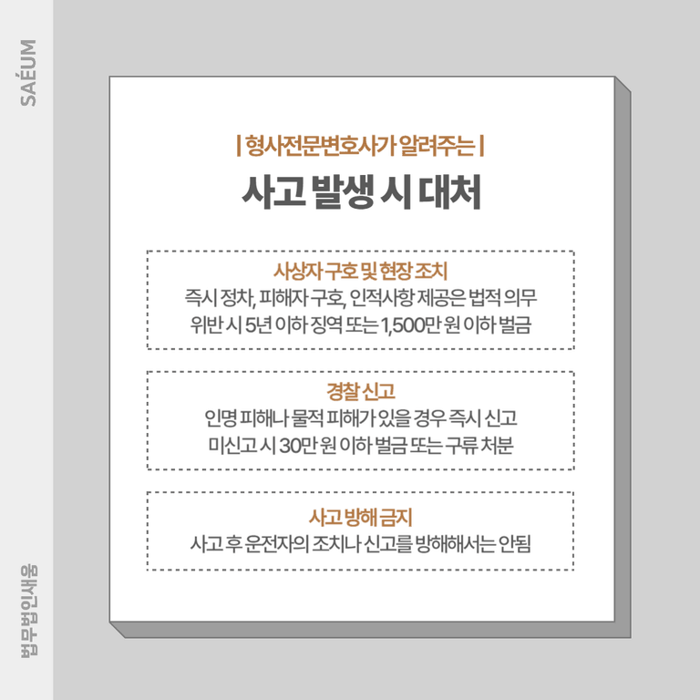 사상자 구호 및 현장 조치: 즉시 정차, 피해자 구호, 인적사항 제공은 법적 의무입니다. 위반 시 5년 이하 징역 또는 1,500만 원 이하 벌금이 부과될 수 있습니다.