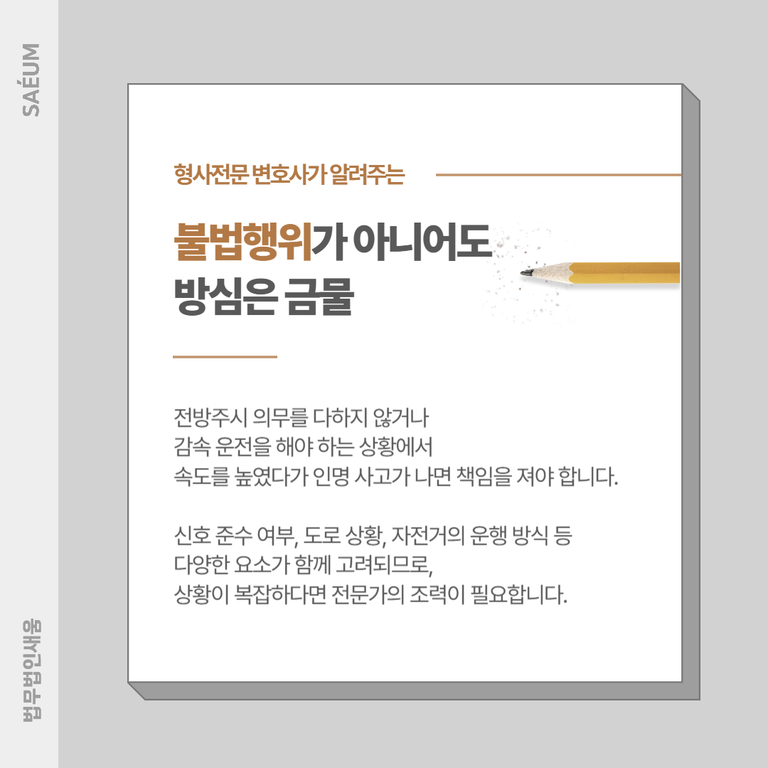 음주운전이 아니더라도, 전방주시 의무를 다하지 않거나 감속 운전을 해야 하는 상황에서 속도를 높였다가 사고가 나면 과실이 인정되어 인명 피해 발생 시 책임을 져야 합니다. 예를 들어, 자전거 도로에서 어린이와 부딪친 사고에서 피고인의 부주의가 인정되어 손해배상 책임이 20%로 제한된 사례가 있습니다.