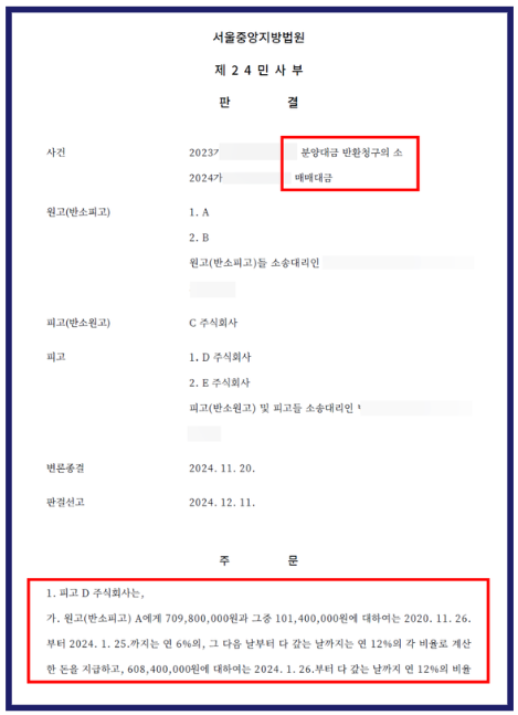 결국 서울중앙지방법원은 아래와 같이 시행사의 기망행위를 이유로 분양계약을 모두 취소하고, "시행사는 기지급받은 분양대금을 모두 반환하라"는 원고(수분양자) 승소 판결을 선고한 것입니다.