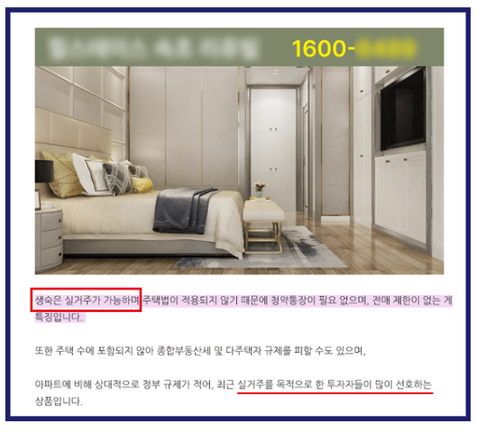 특히 국토부는 생활형 숙박시설과 관련한 잡음이 증가함에 따라, 건축법 시행령 등을 개정해 시행사가 이러한 시설에 대해 주거용으로 사용할 수 없다는 점을 명확하게 명시·고지하도록 규정하고 있으며, 주택 사용이 가능한 것처럼 설명하는 허위·과장 광고를 엄격히 금지하고 있습니다.