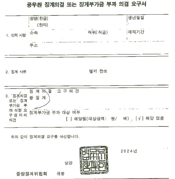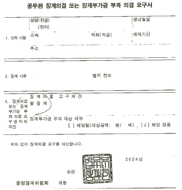 공무원 신분이 5급 이상인 경우는 중앙징계위원회에서 심의가 이루어지게 됩니다.