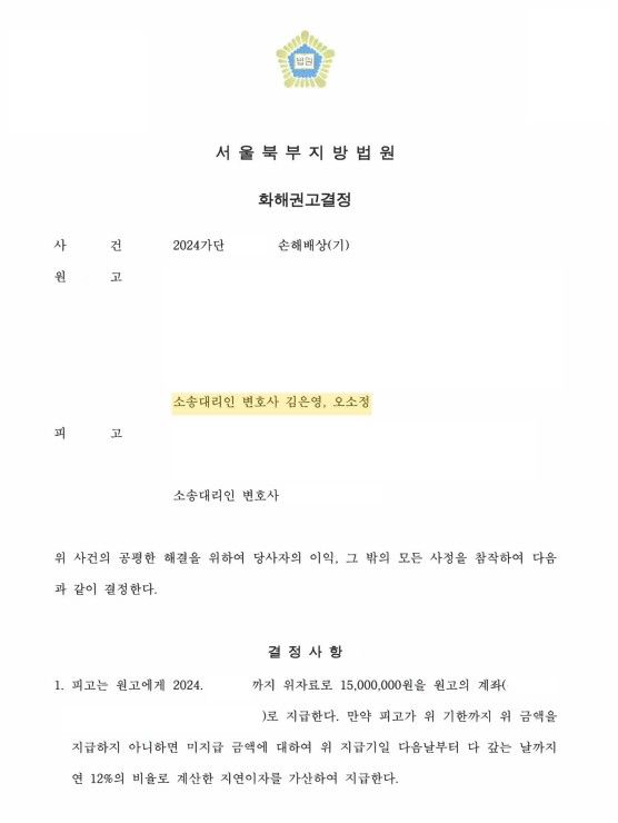 그 결과, 재판부는 1) 상간자가 의뢰인에게 위자료 1,500만 원을 지급하고, 2) 의뢰인의 배우자에 대한 구상금 청구 또한 포기하며, 3) 상간자의 배우자가 추가적인 소송을 제기하지 않는 조건을 추가한 내용으로 화해권고결정을 내려주셨고, 양측 모두 이의하지 않으며 사건 종결하였습니다.