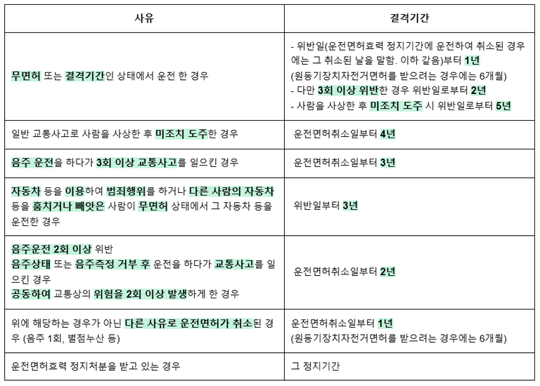 운전면허 결격기간에 대하여는 도로교통법 제82조 ②항에 자세히 정하고 있는데요, 주요 사유들에 맞춰서 정리하자면 아래와 같습니다.