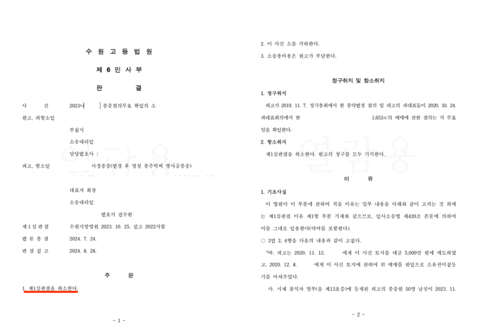 1심 판결 취소 (1심은 원고 전부승소하였으나 항소심에서 전부패소로 변경)