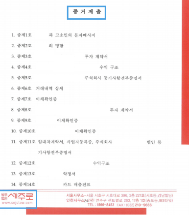 실제로 위 사건의 고소대리를 맡은 저는 신속하게 사기피의자에 대한 형사고소를 진행하면서 의뢰인께서 충분히 증거자료를 준비하실 수 있도록 자세히 설명드렸고, 무려 제20호증이 넘을 정도의 방대한 증거들을 깔끔히 정리하여 고소장을 작성, 수사기관에 제출하였을 뿐만 아니라