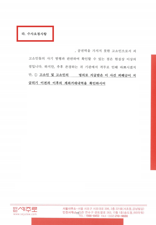 수사기관에서 사기피의자에 대한 수사를 진행하고, 혐의를 판단하는 데에 있어 도움이 될 만한 사항들에 대해 정리하여 '수사요청사항'을 별도로 기재함으로써 수사기관이 신속하고 정확하게 사기피의자를 수사할 수 있도록 조치를 취하였습니다.