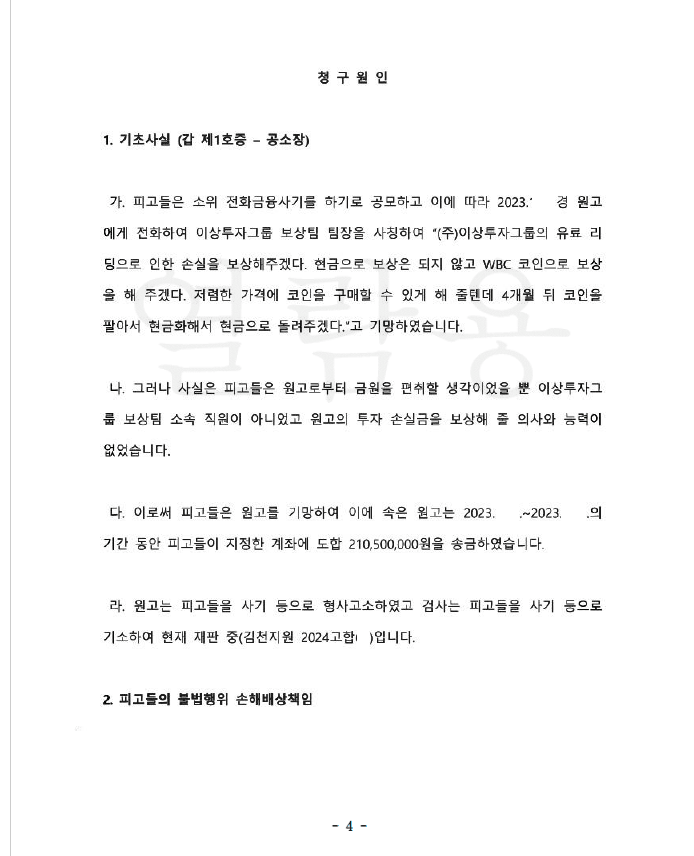 저는 즉각 입건된 가해자들을 피고로 하여 민사소송 손해배상청구소송을 제기하였고 법원은 원고 승소 판결을 선고하여 의뢰인은 피해액을 반환받았습니다.