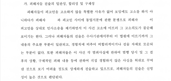 가해자는 변호인을 선임하여 치열하게 사실관계를 다투고 범행을 부인했습니다. 수사절차, 재판절차 내내 불필요한 주장을 반복하는 등 사실을 호도하였으나 결국엔 유죄가 선고되어 법정구속되었습니다. 판결 이유를 살펴보면 피해자의 진술은 일관되고 구체적이어서 혐의를 인정하는데 충분하다고 판시하고 있습니다.