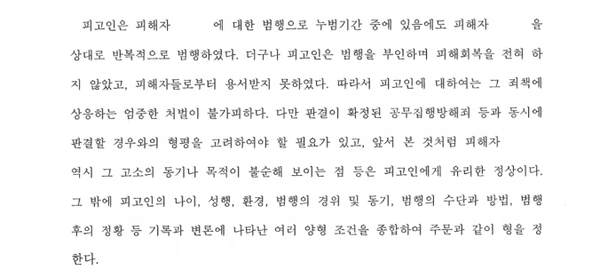 그러나 아쉬운 점은 고소인의 고소가 불순하다는 이유로 피고인에게 유리한 양형을 적용하여 2년밖에 실형을 선고하지 않았다는 점입니다. 고소인의 고소가 불순한 것과 피고인의 범행 성립이 어떤 상관관계가 있는지, 그게 양형관계에 영향을 주는지 지극히 의문입니다. 대법원 양형기준표상에도 없는 양형기준을 적용하여 검사가 구형한 7년에 비하면 턱없이 낮은 2년이 선고되었습니다. 검사는 당연히 항소한 상태이고 피해자를 적극 조력하여 피고인이 더 큰 처벌을 받도록 노력할 예정입니다.